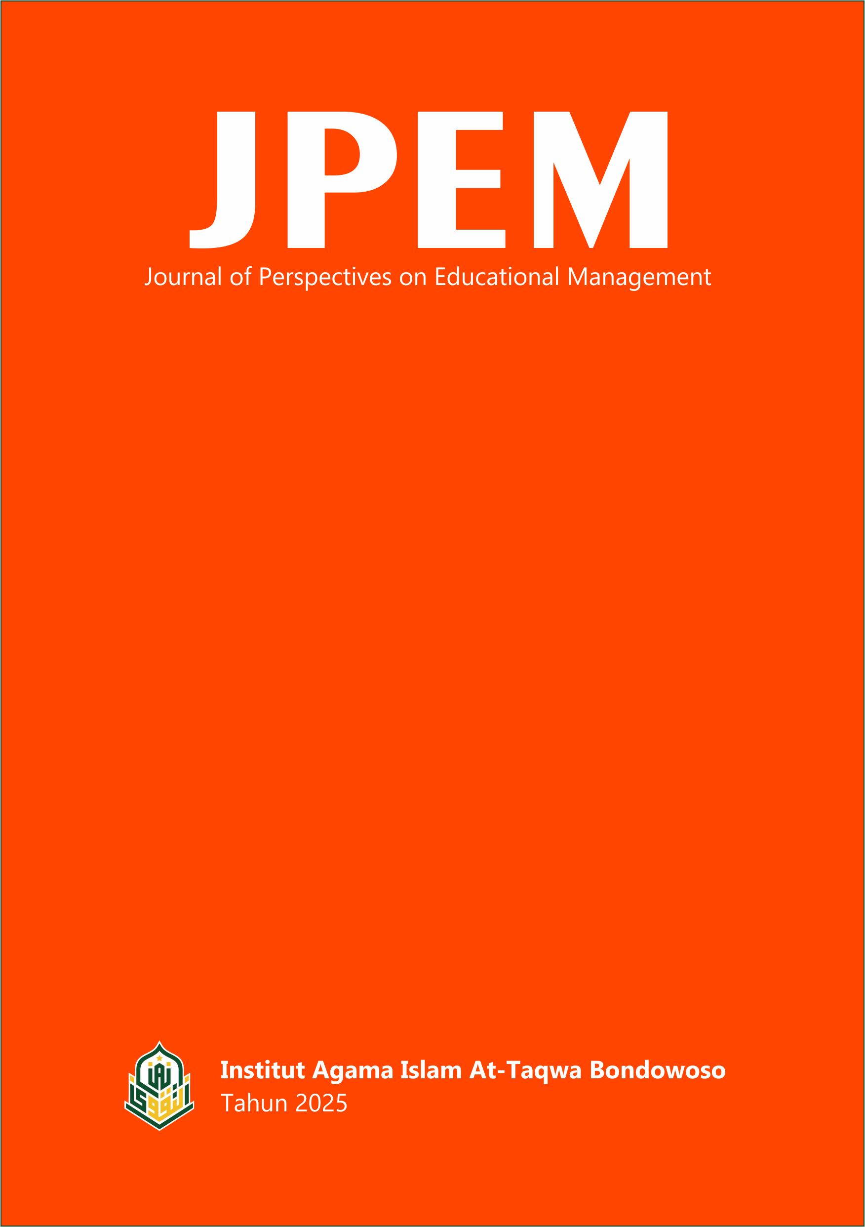 Vol. 1 No. 1 (2025)JPEM: Journal of Perspective on Educational Management is published by the Postgraduate Program of At-Taqwa Islamic Institute of Bondowoso, East Java, Indonesia. The journal publishes articles of interest to educational practitioners, teachers, educational policy makers, and researchers. The journal includes research articles, original research reports, reviews in Islamic education in various areas including: 1) Leadership, 2) Public Relations Management, 3) Organizational Behavior, 4) Organizational Culture, 5) Human Resource Management, 6) Financial Management, 7) Decision Making, etc.